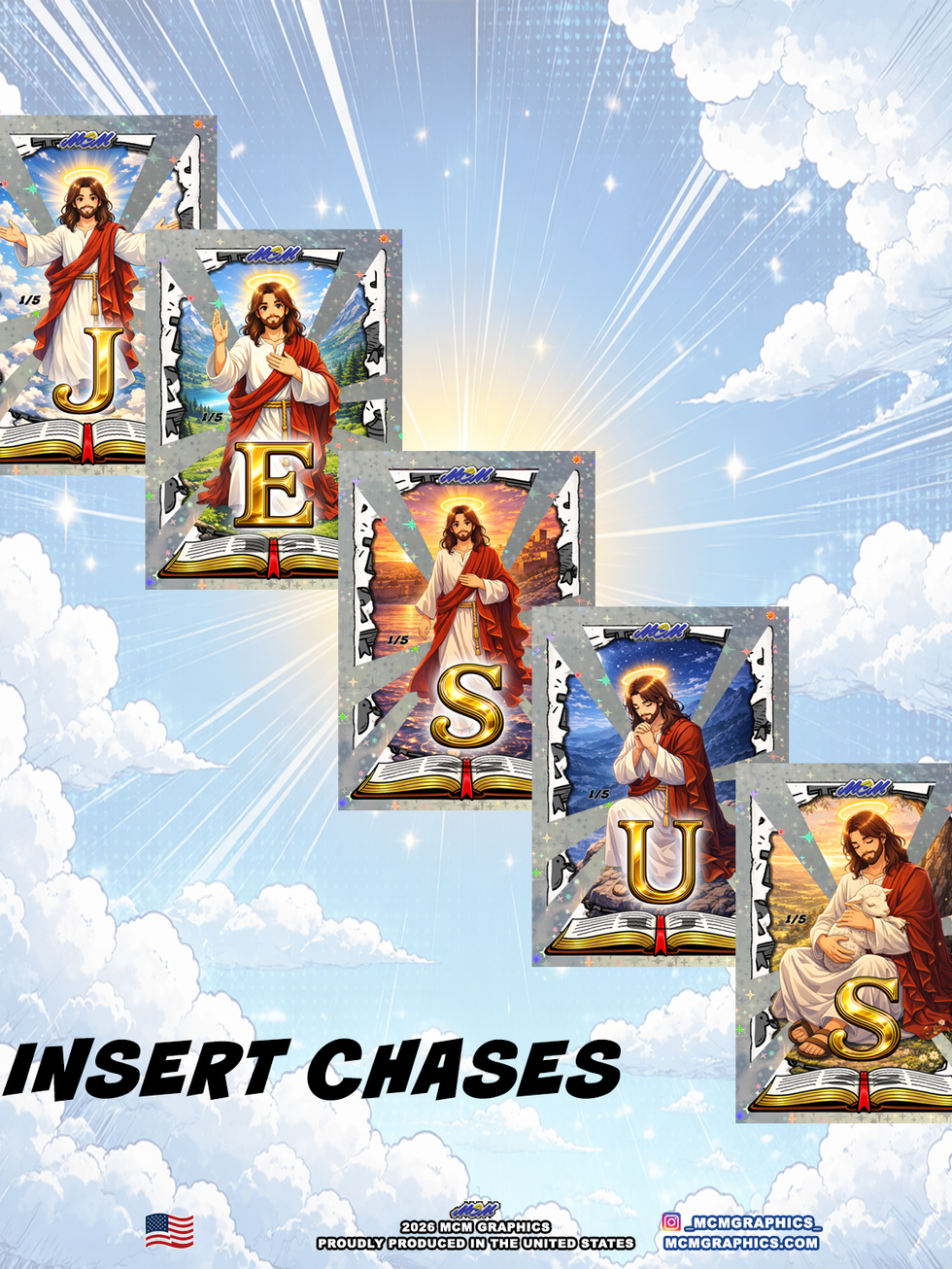Each pack contains 4 premium cards, randomly pulled from a 30+ design master set featuring legendary scenes, miracles, heroes, and turning points from the Old and New Testaments. Every card is built with the same attention to detail and emotional impact that defines MCM Graphics—rich colors, dramatic compositions, and a reverent, display‑worthy finish.
